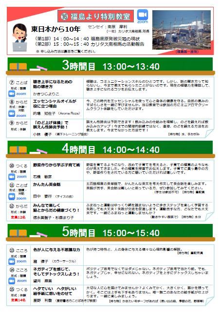 くらし | 福島県の原発被災地における現状、復興のこれまでと課題について。復興支援活動の中でお聞きした被災住民の方の声も交えながら、お伝えできればと思います。 形式:聴講【zoom】 |